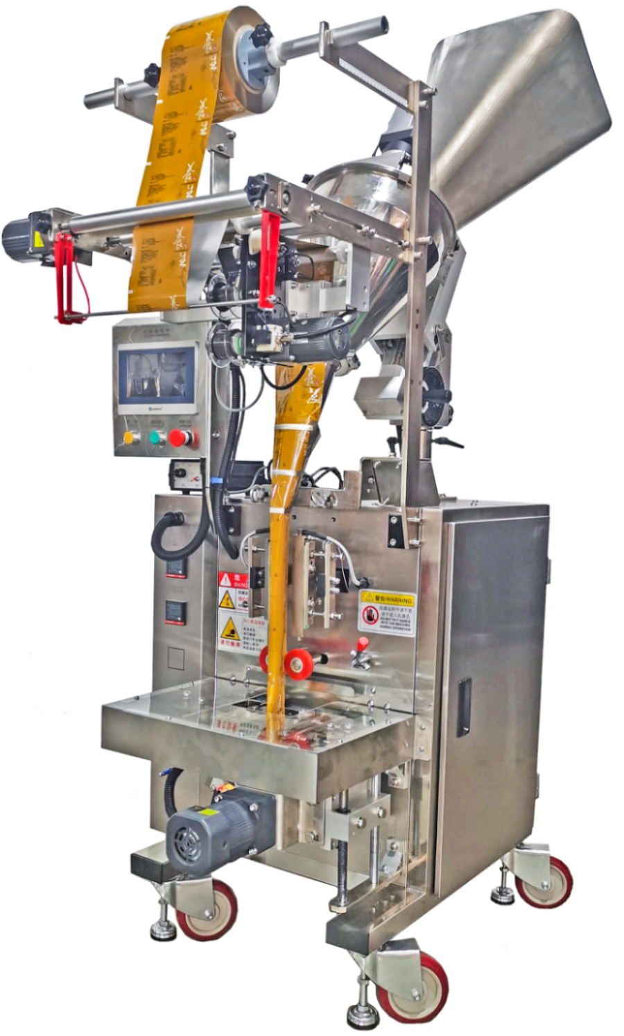 三角包茶葉包裝機可自動完成計量、制袋、填充、封合、計數、光電跟蹤、分切、充氣等動作;成品形狀呈三角形,新穎別致。本機采用變頻調速控制,確保每一系統性能穩定,操作方便,工作效率高...